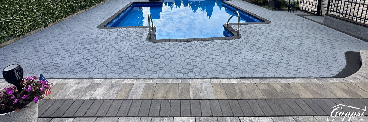 Recently, Gappsi completed a patio paver stain from Crab Orchard (pink/peach color) from Nicolock to gray. The client chose to stain the pavers in gray and the coping in black, changing the color of the backyard to a gray tone.