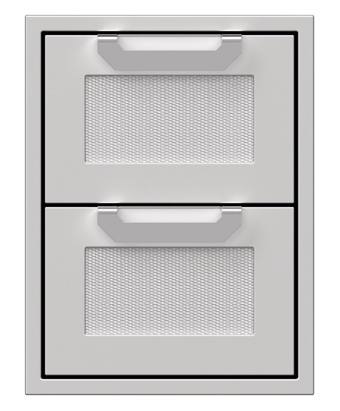 Heavy-duty storage drawers keep your supplies within easy reach. The commercial-grade handles, recessed Marquise Accented™ panels and heavy-gauge welded body complement Hestan grills in form and function.