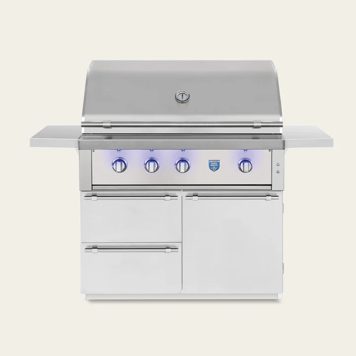 The integrated cart features a 2-drawer storage system and cabinet, keeping everything organized and within reach. Custom grill grates and interchangeable faceplates allow you to define the look of your grill. The Estate 42″ Freestanding model supports outdoor spaces built for hosting, sharing, and staying longer.