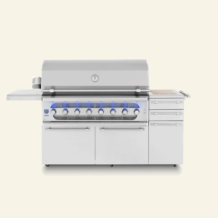The freestanding cart adds functionality with integrated storage, side shelves for prep, and mobility that adapts to your space. The Muscle 54″ Freestanding Grill is built for those who want a grill that delivers both scale and impact.