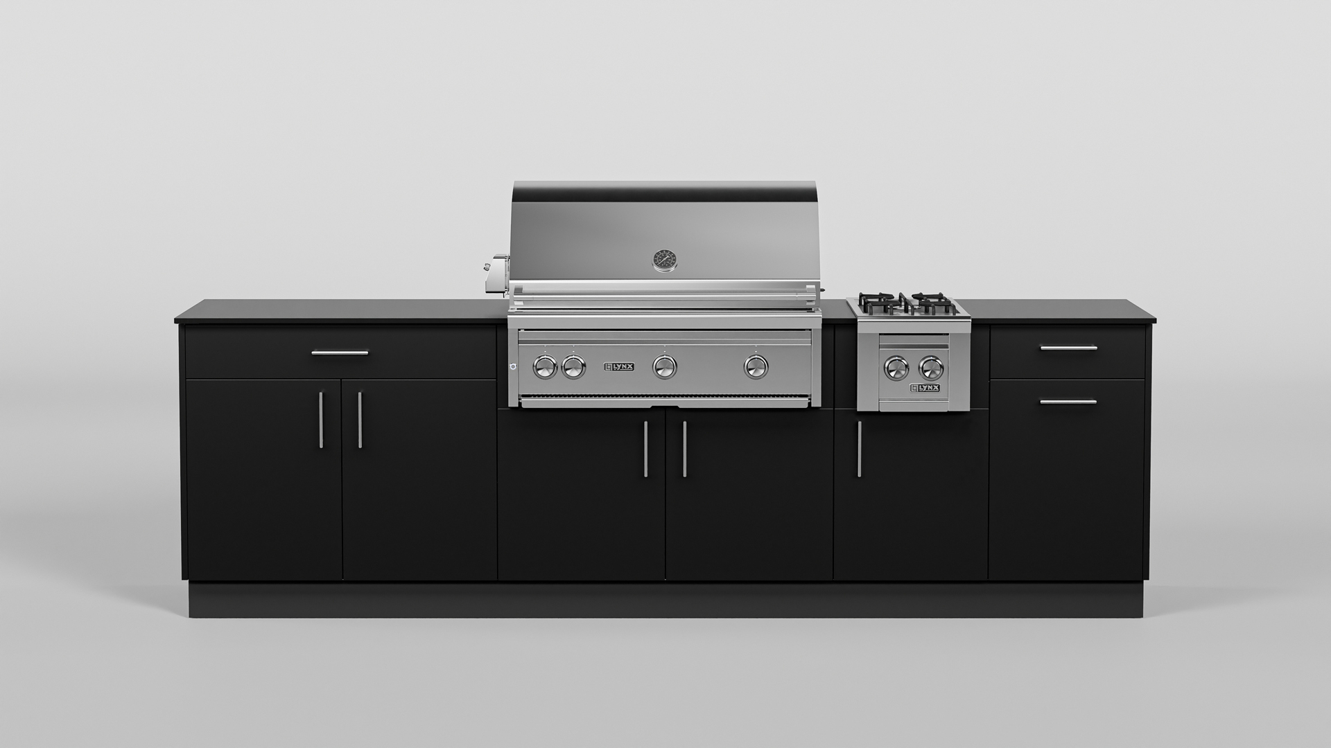 This configuration is generous with storage and counter space. It includes a door/drawer combination base cabinet, a side burner cabinet, and a trash pull-out cabinet. Shown in Midnight Matte.